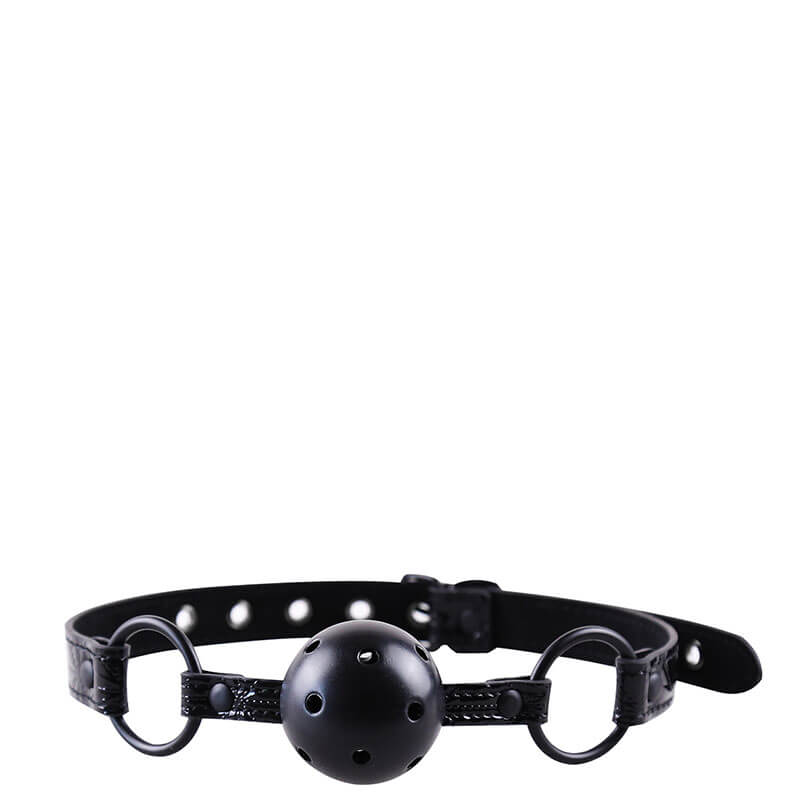 Mordaça de bola preta com acabamento brilhante em alto relevo, forro interno e fivela ajustável.