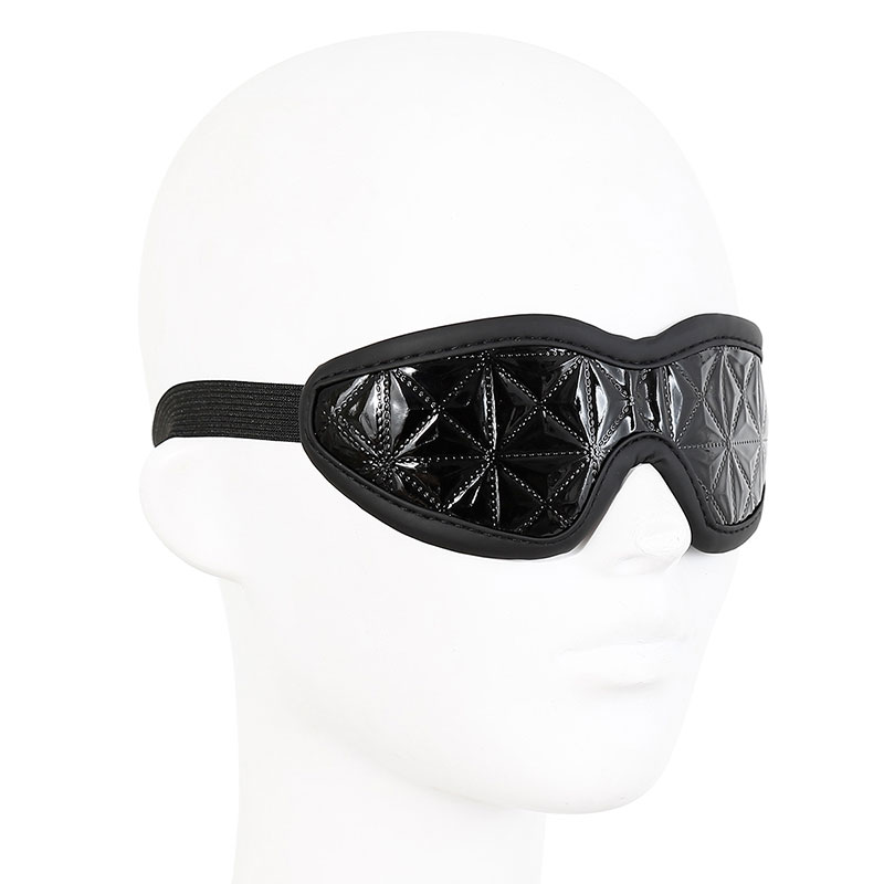 Venda para os olhos preta com acabamento brilhante em alto relevo, forro interno e tira ajustável.